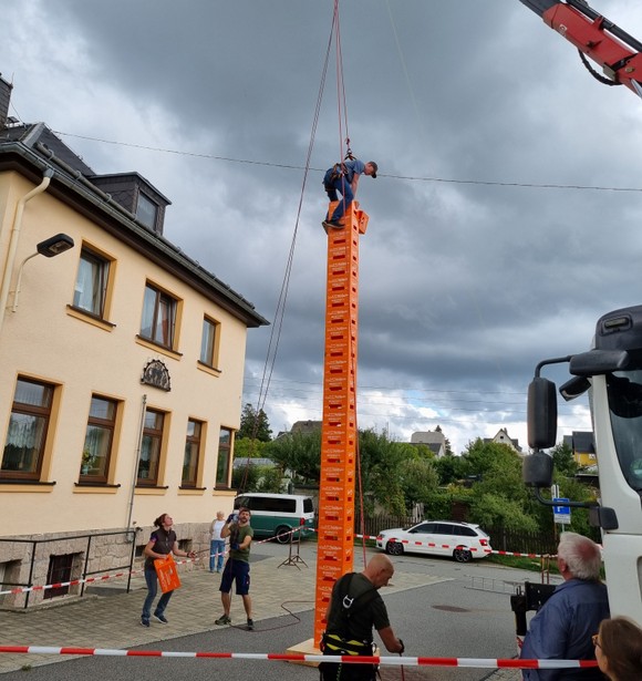 Für das leibliche Wohl war natürlich auch hervoragend gesort. Unsere Sportfrauen hatten 28 leckere Kuchen gebacken und es gab leckere Eis vom Rößler-Hof. Außerdem gab es Bratwurst vom Holzkohlegrill und natürlich reichlich Getränke für jederman. Das Bierkasten-Stapeln hat sensationell und praktisch in der Nachspielzeit, Ella Roscher gewonnen. Sie hat unglaubliche 32 Kästen gespapelt bis sie letztendlich den Halt verloren hatte. Hier im Bild ist Michael Langer zu sehen, der knapp von Ella Roscher geschlagen wurde.