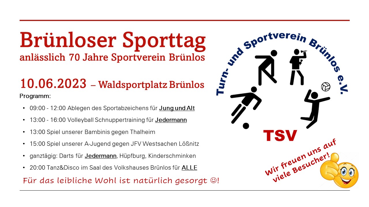 Am 10.06.2023 lädt der TSV Brünlos zum Sporttag auf den Waldsportplatz Brünlos ein.