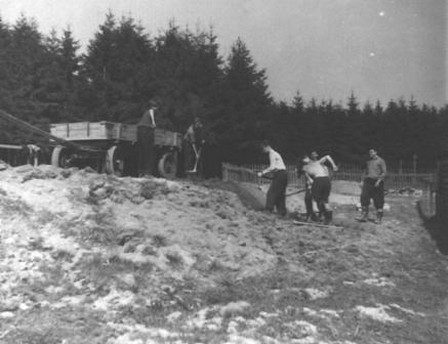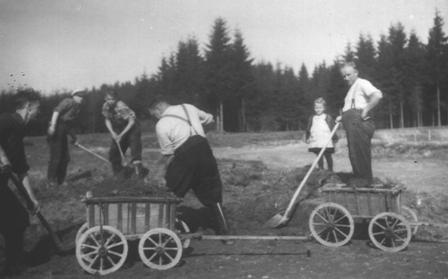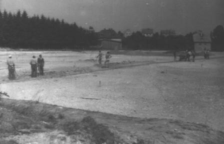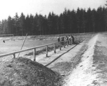 Mit Hacke und Schaufel wurde Wochenende für Wochenende (damals war der Sonnabend noch ein Werktag) daran gearbeitet, das Gefälle von der oberen Waldecke abzutragen und in der Diagonalen am unteren Fußballtor aufzufüllen. Anleitung gaben jeweils im Bauwesen erfahrene Einwohner wie zum Beispiel der Schulhausmann Arthur Weißflog, Fritz Bernhardt, Heinz Hallfahrt und viele andere.